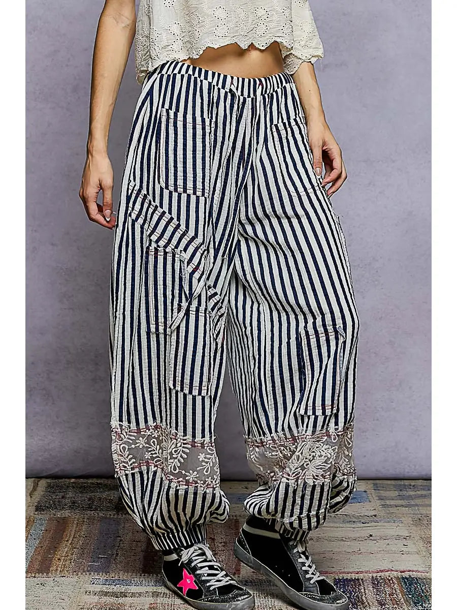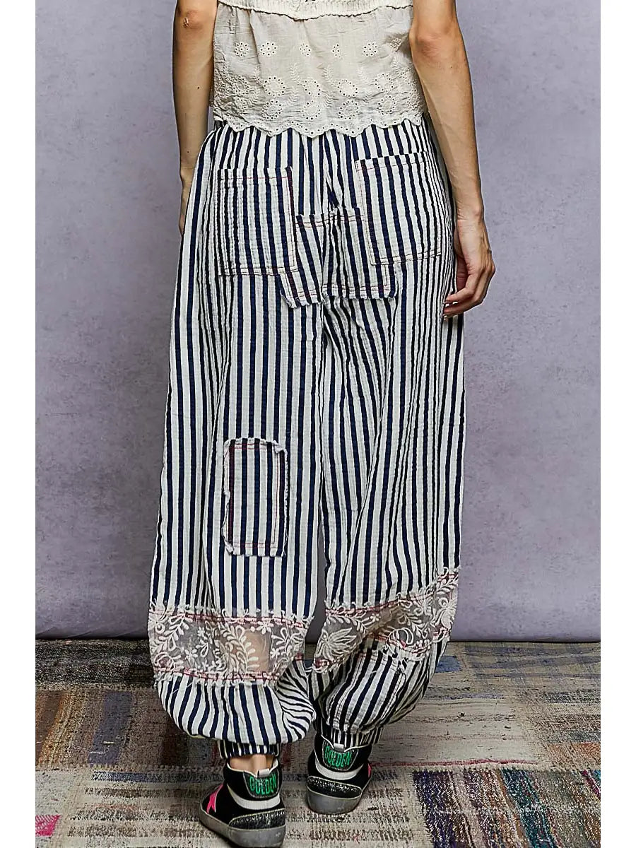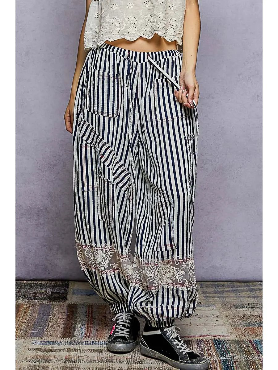 Effortless comfort meets laid-back style with these Easy Day Stripe Pants. Crafted from breathable double gauze fabric with delicate lace see-through patches, they're perfect for relaxed days when you want to look put-together without trying too hard. The jogger silhouette keeps things casual and cozy, while the striped pattern adds visual interest. Slip them on for weekend errands, coffee dates, or lounging at home—they're the pants that do all the work so you don't have to.