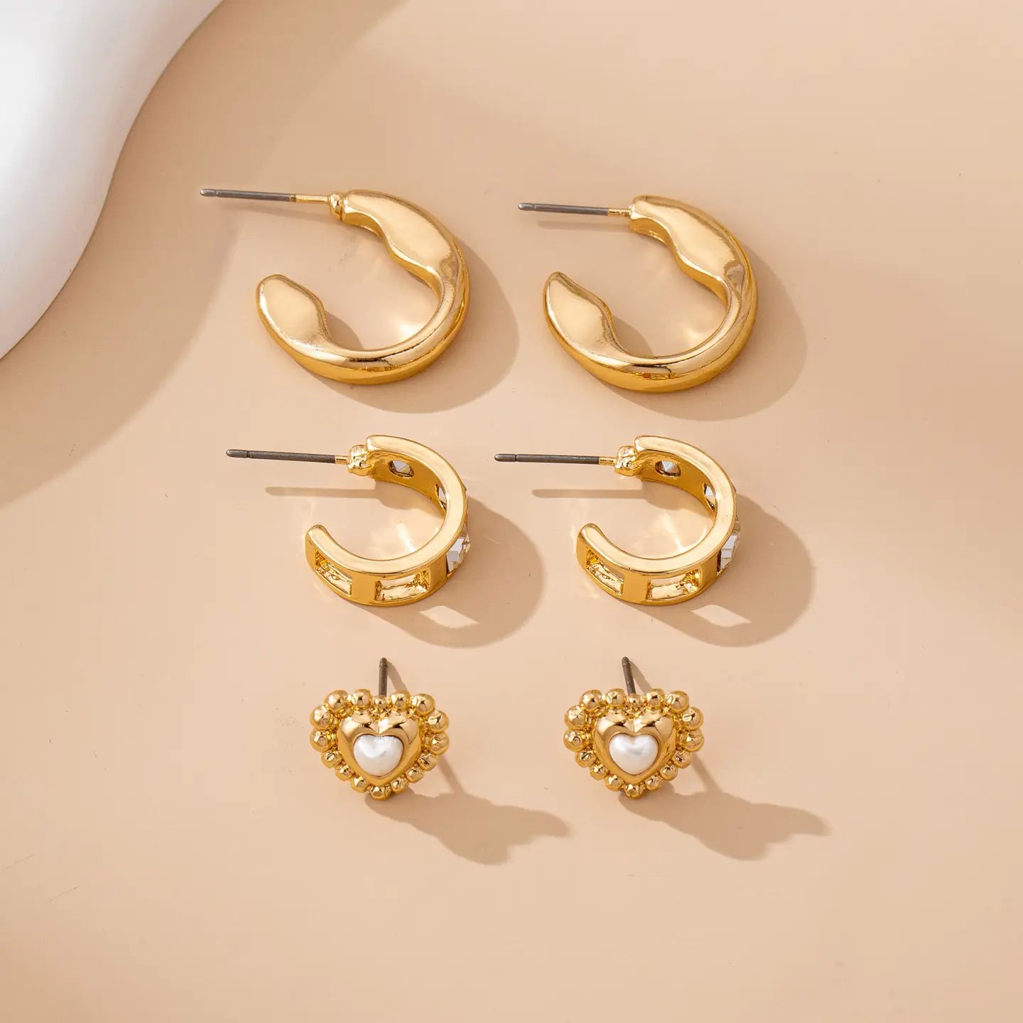 Curate your ear stack with three essential pieces that deliver instant romance. This trio pairs delicate beaded pearl heart studs for understated charm, baguette rhinestone huggies that catch the light with every turn, and polished twisted dome hoops for dimensional texture. Mix, match, and layer them however your mood strikes—each piece shines solo or together for that coveted multi-piercing sparkle.