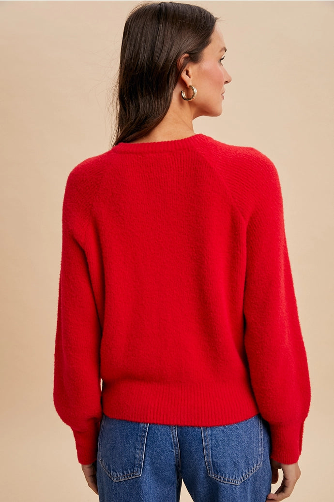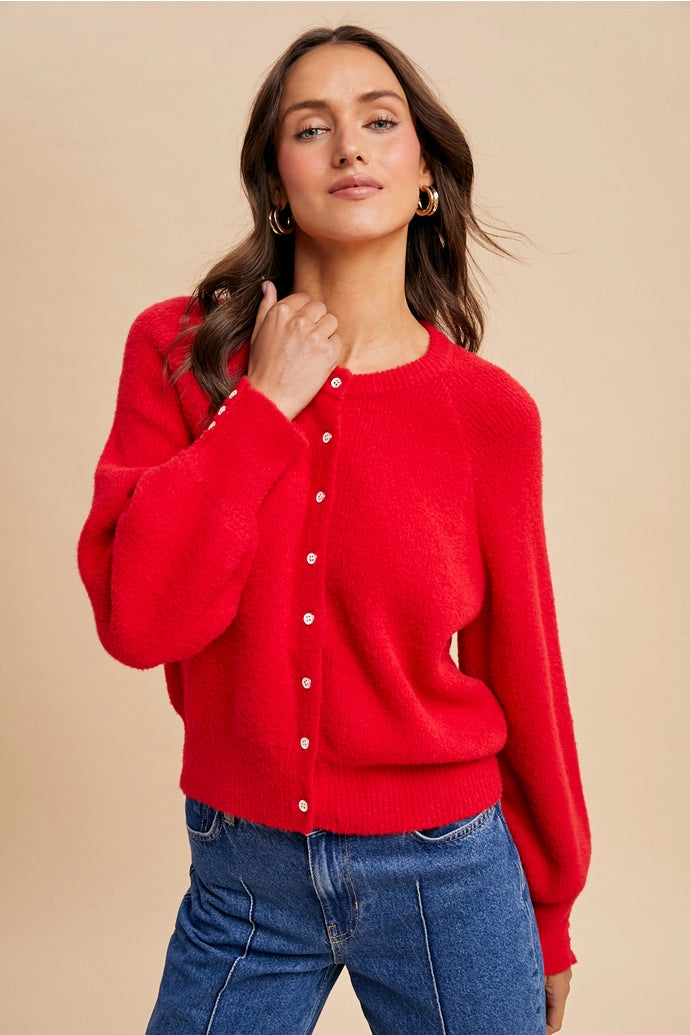 Wrap yourself in cozy charm with this fuzzy ribbed cardigan, complete with gleaming gold-edged enamel buttons that add a touch of sophistication. The soft, textured knit feels as good as it looks, while those statement buttons elevate your everyday layers into something special. Perfect for throwing over your favorite outfit when you need warmth with personality.