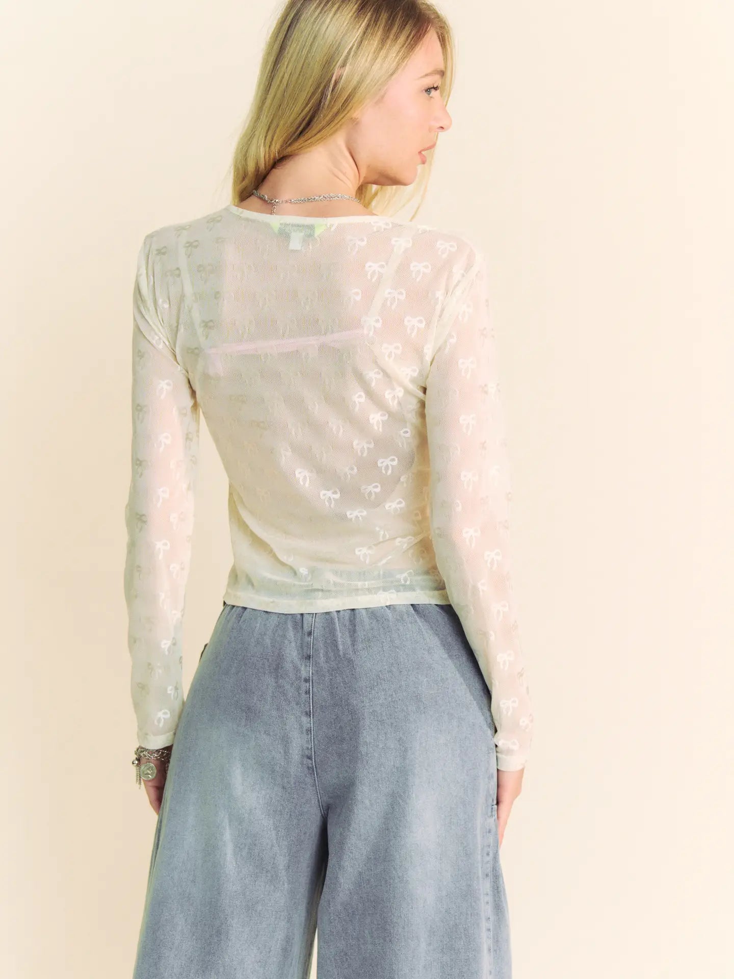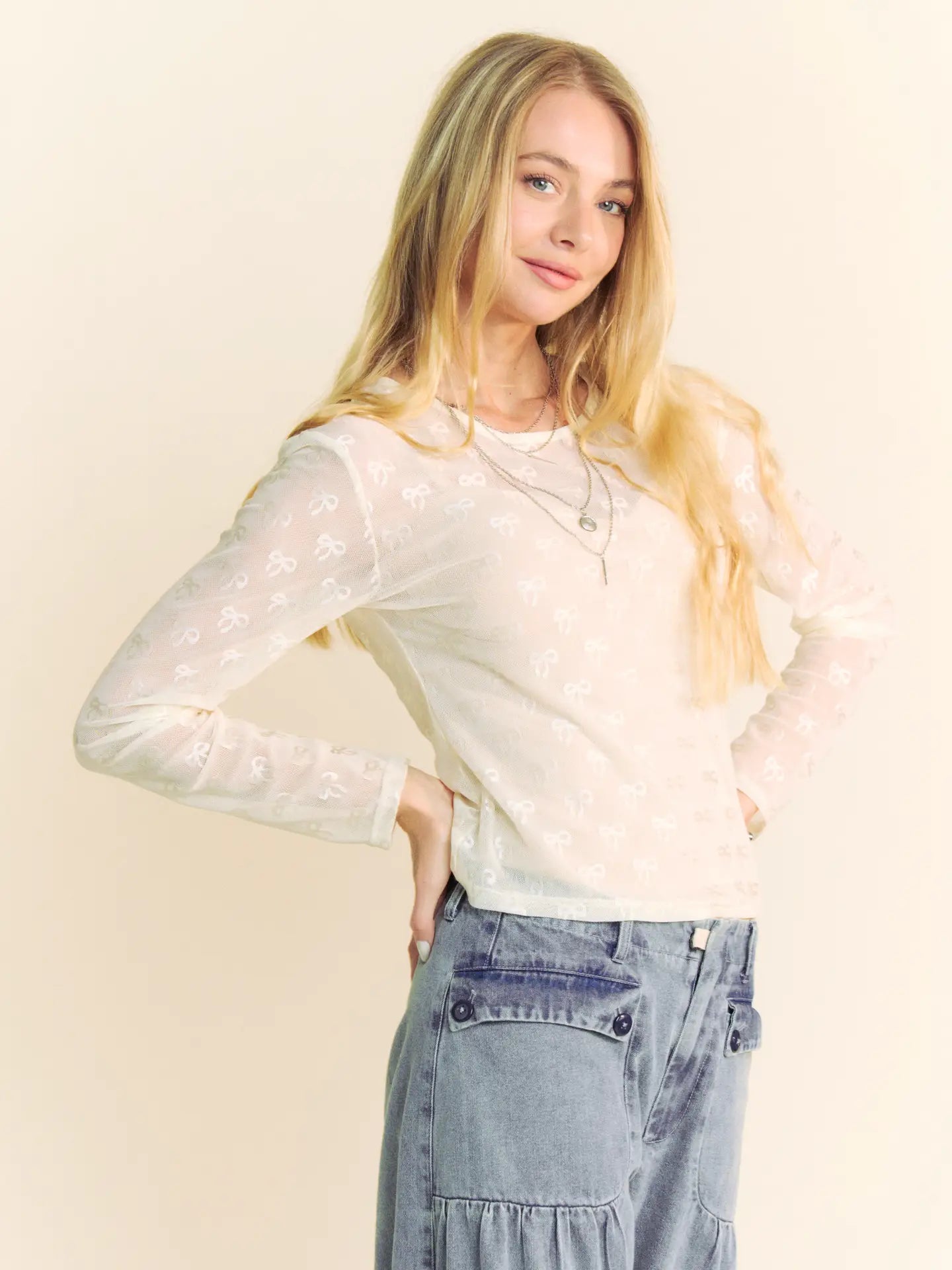 Elevate your layering game with this whimsical ribbon-embroidered sheer top. Delicate mesh fabric creates an airy, romantic silhouette, while intricate ribbon detailing adds a touch of vintage-inspired charm. The long sleeves offer versatile coverage, making it perfect for pairing over basics or wearing solo for an effortlessly chic look. A playful piece that transforms any outfit into something special.