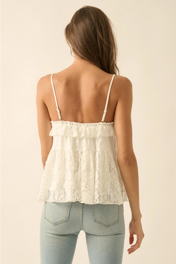 Effortless romance meets everyday comfort in this cotton gauze and lace cami. A straight neckline frames delicate ruffle detailing, while the crochet lace bodice features a charming tie accent and floral lace ruffle. Sleeveless with adjustable shoulder straps and a flattering low back, this babydoll silhouette drapes beautifully with a relaxed fit. Ruffled lace hem and full lining complete the look.