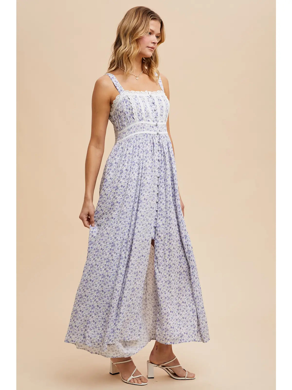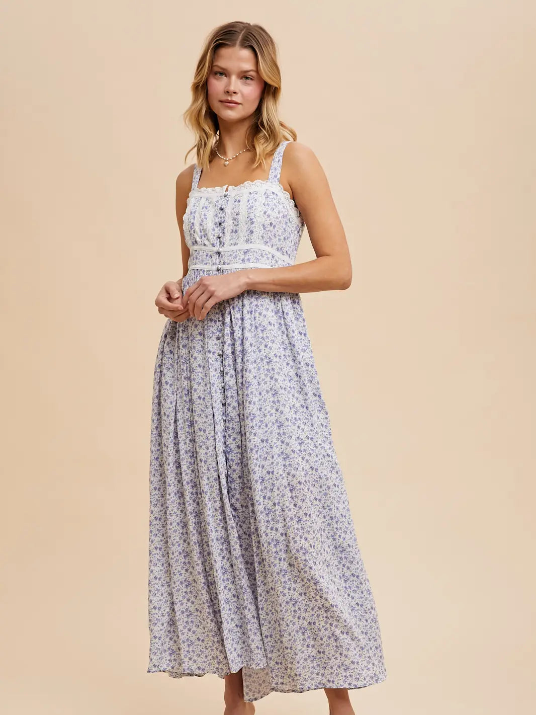 An elegant sleeveless maxi with timeless appeal. This piece showcases a practical button-front closure with covered buttons, piped trim detailing, and a feminine lace panel at the bodice. Adjustable straps provide flexibility in fit, while a concealed side zip and smocked back create subtle shaping. Complete with full lining for a polished finish. Ideal for special occasions, garden celebrations, or any moment that deserves refined style.
