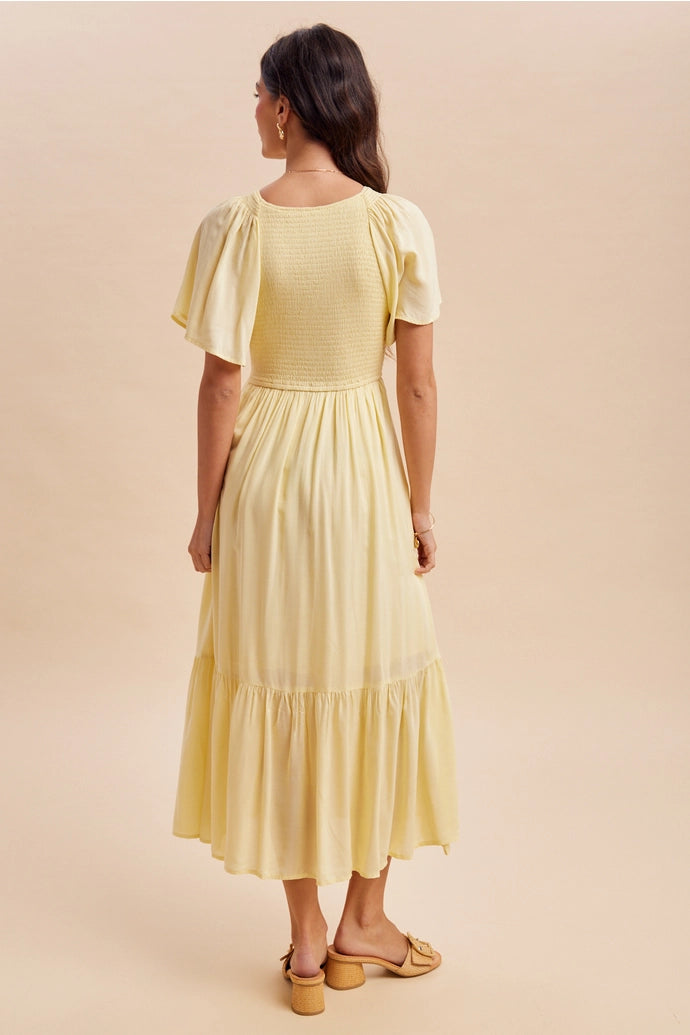 The Lemon Drop Dress features a graceful silhouette with modal fabric that feels soft against the skin. Delicate smocking at the bodice adds texture and visual interest, while flutter sleeves create an effortless, romantic movement. Double-lined construction ensures opacity and durability, making this piece both beautiful and practical for everyday wear or special occasions.