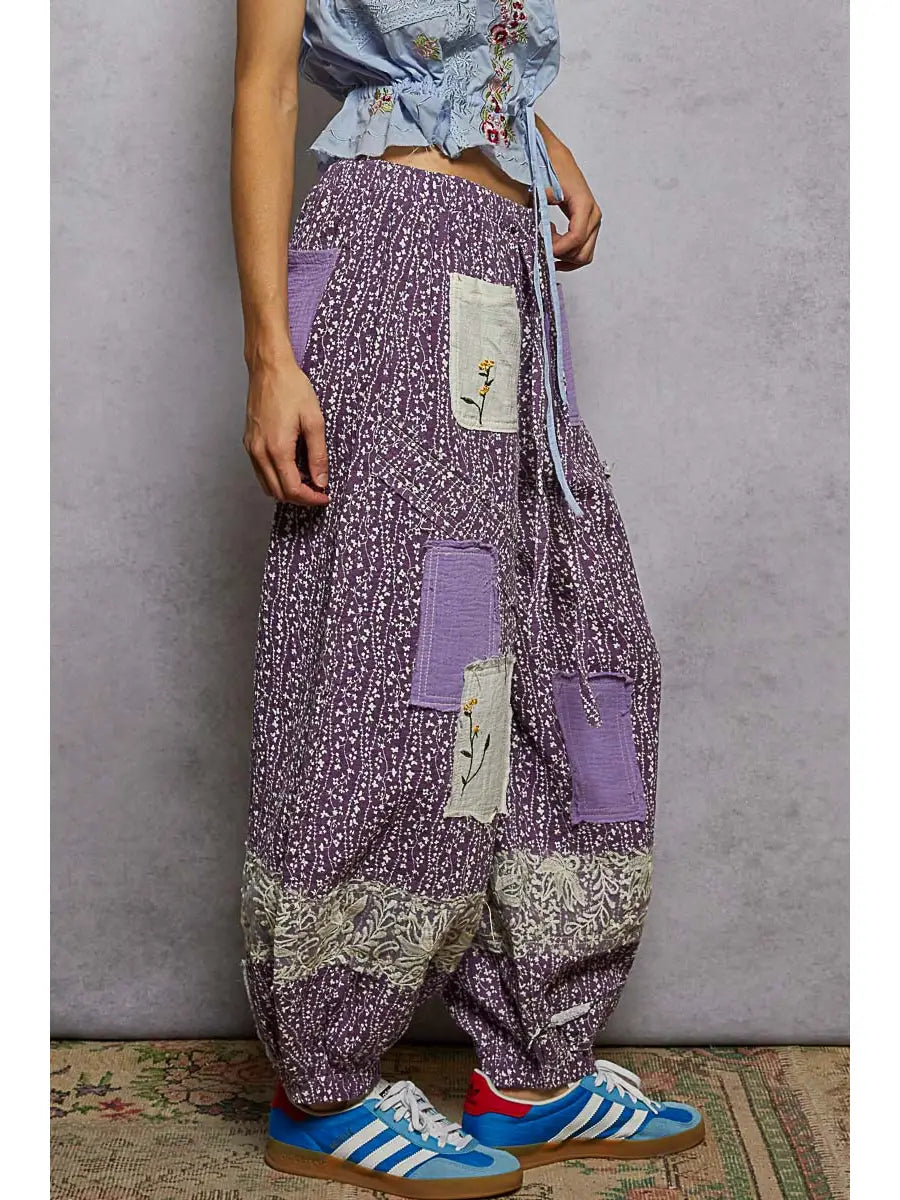 Perfect for spring, these lightweight gauze joggers keep you cool and comfortable through the seasons. Soft elastic waistband and adjustable fit pair with artisan details—stitched fabric, lace and embroidered patches, floral pattern, and vintage washing—for effortless everyday style.