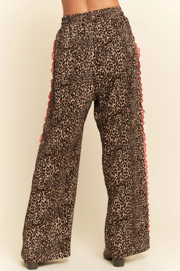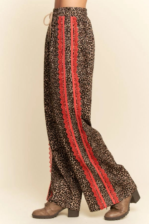 Make a statement with these Wild About You Ribbon Pants, featuring eye-catching lace-trimmed side panels that add an unexpected edge to your everyday look. The wide-leg silhouette offers comfort and movement, while the elastic waist ensures an easy, flattering fit. Perfect for those who love mixing bold details with wearable style—dress them up or down and let your personality shine through.